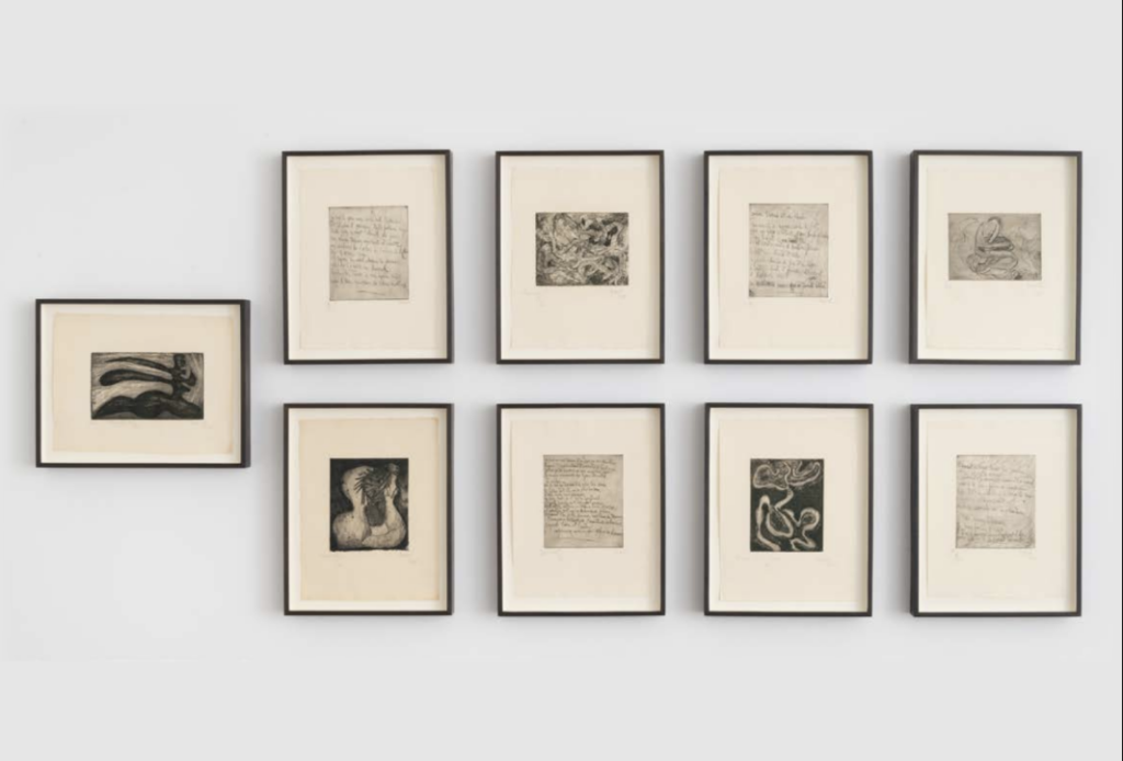 Maria Martins, a key figure of Brazilian modernism associated with Surrealism, is represented by the remarkable portfolio produced in 1946, comprising nine etchings published by the Valentine Gallery in New York and printed by the artist herself. The prints reproduce sculptures originally presented in her exhibition at the Valentine Gallery, several of which later became among her most celebrated works, set against the dense black ink background of the printing plate. Martins personally produced the editions using a small press installed in a room next to her studio, highlighting the experimental and hands-on dimension of her practice. An edition of Maria 1946 (1946), presented at ARCO, was previously exhibited in Maria Martins: Tropical Fictions at MASP – Museu de Arte de São Paulo, 2021.