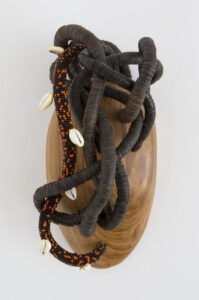 Carved wood, vinyl records, glass beads (orange and black), cowrie shells