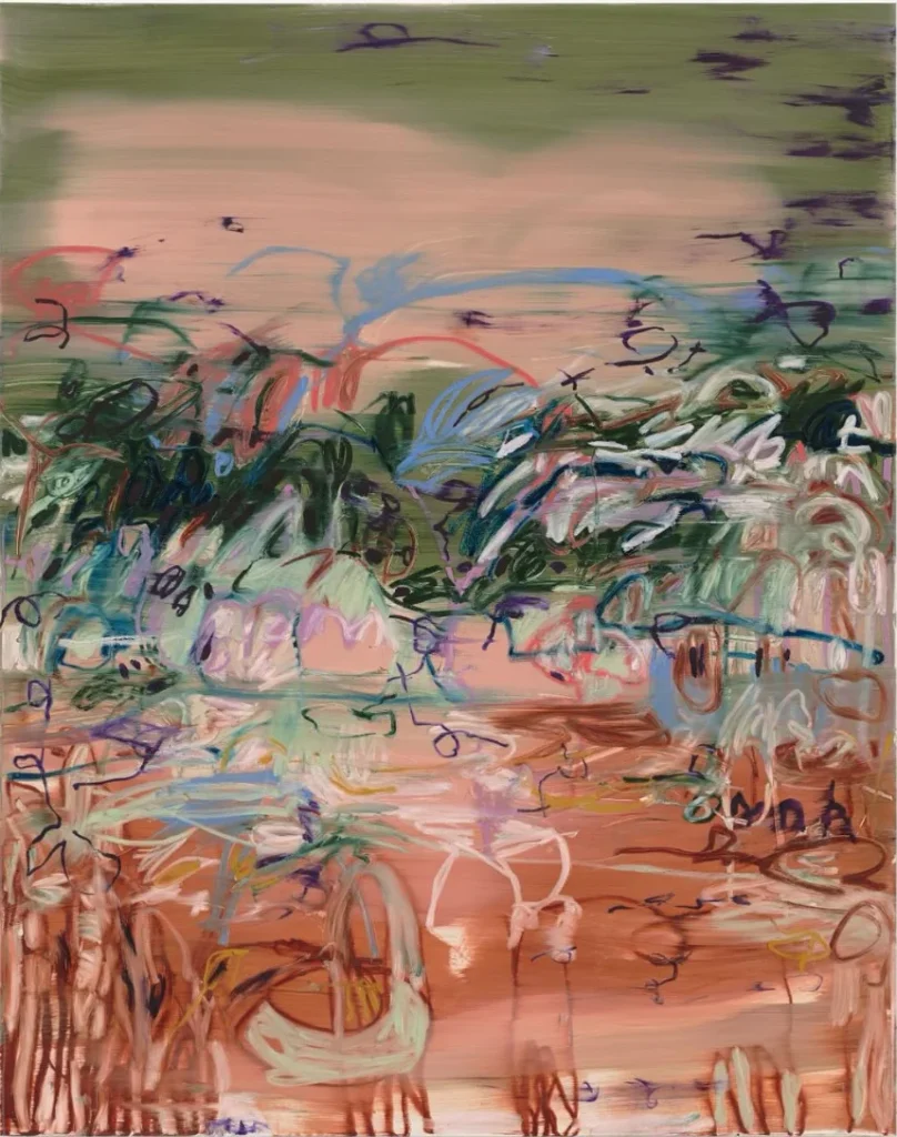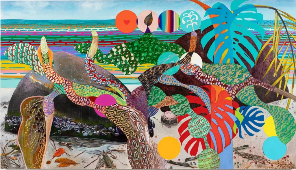 Titled Jurerê, 2025, the large-scale acrylic on canvas continues Zerbini’s exploration of vibrant compositions that blend elements of landscape, abstraction, and meticulous patterns, offering a more contemplative counterpoint to the immersive, environmentally charged installation on view in Unlimited.
