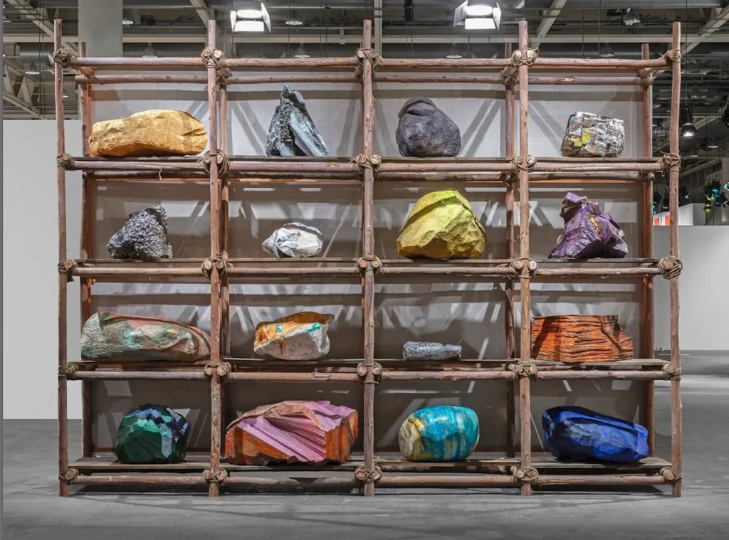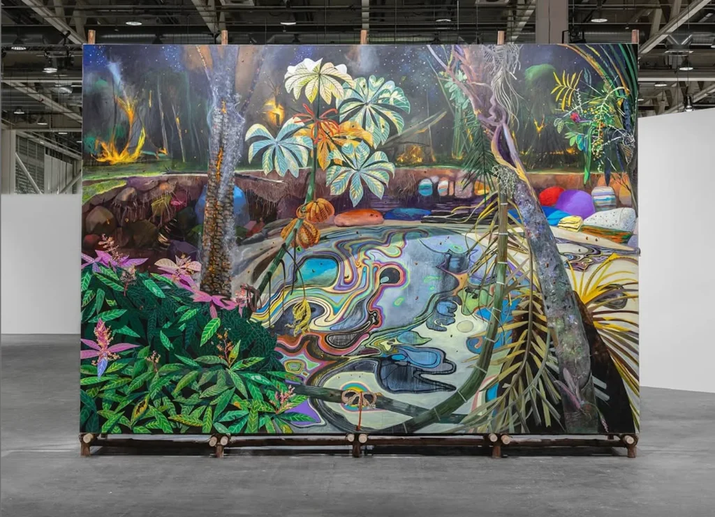 At Art Basel Unlimited, Fortes D’Aloia & Gabriel, in partnership with Sikkema Jenkins & Co. and Stephen Friedman, presents Os Comedores de Terra, 2025, a major new work by Luiz Zerbini. The immersive 360-degree installation combines a five-meter painting with vibrant sculptures that mimic precious stones and mineral formations using the trompe-l’oeil technique. Addressing the environmental impact of gold mining and the contamination of the Amazon River, the work creates a striking dialogue between painting and sculpture, bringing the depicted minerals into the physical space.