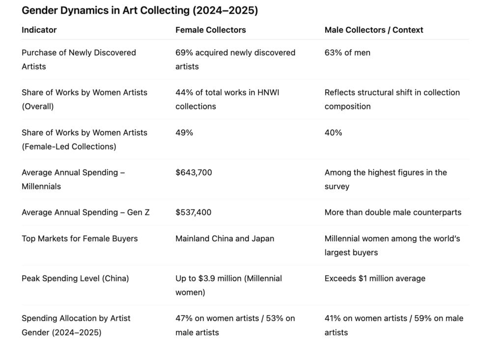 Spending patterns reinforce this shift. In 2024/2025, women allocated 47% of their art spending to works by female artists and 53% to works by male artists, while men devoted 41% of their spending to female artists and 59% to male artists. Generational differences further accentuate this trend: Gen Z collectors spent 45% of their budgets on works by women artists (and 55% on male artists), compared with just 25% among boomers (and 75% on male artists).