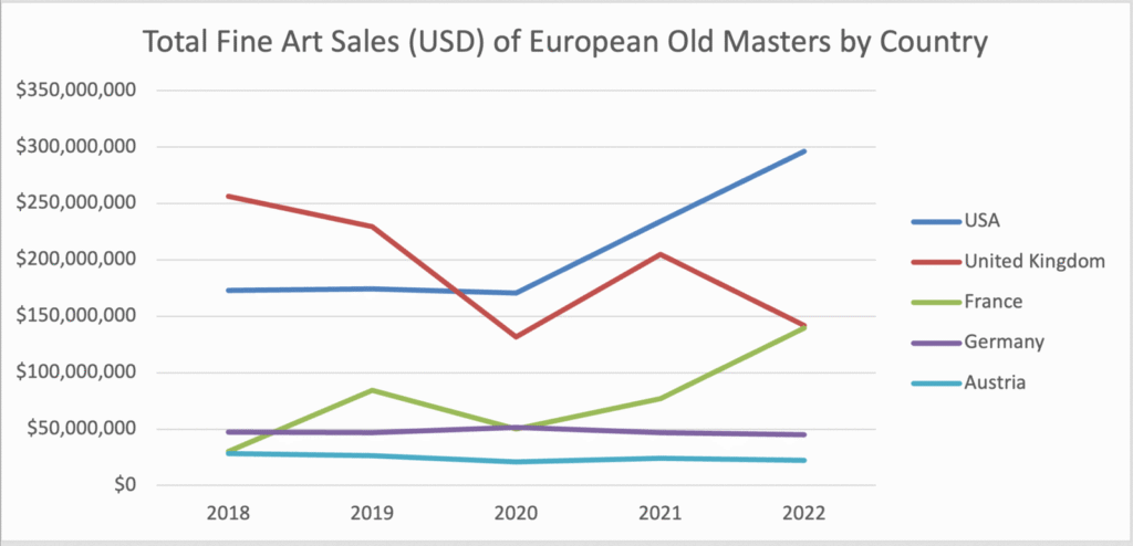 The US dominated the global European Old Master auction market in 2022, as the country’s auction houses realized a total of $296.1M in the genre – the highest total since 2018. The UK, on the other hand, achieved less than half that amount in 2022 ($141.9M). This is explained in particular by an uneven distribution of the best-selling Old Masters lots. Of the 15 most expensive European Old Masters sold at auction in 2022, 7 were offered in the USA (including the top four), compared with 6 in the UK.