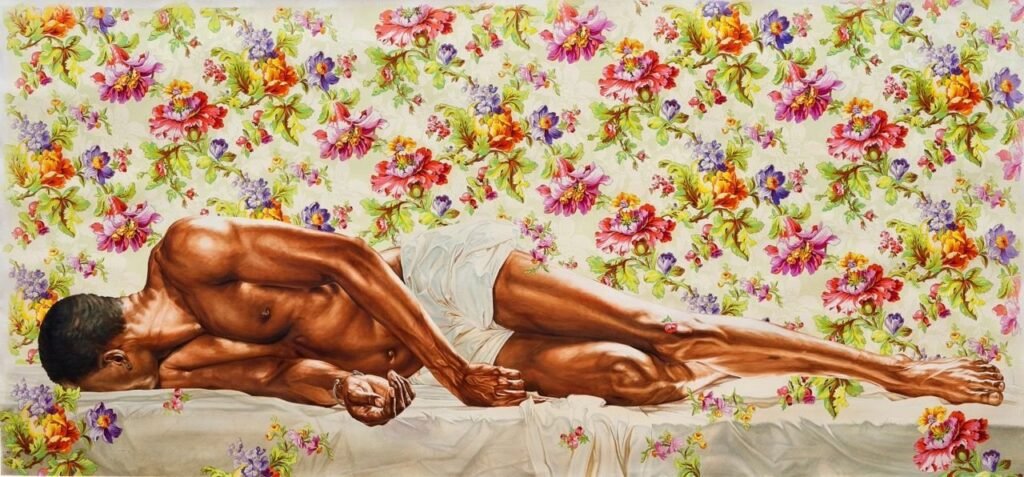 Wiley’s use of Old Master motifs to depict Black subjects. His lush, narratively rich canvases draw on textile patterns and the compositional tenets of Old Masters such as Peter Paul Rubens and Jacques-Louis David. He was selected by President Barack Obama in October 2017 to paint his official portrait for the National Portrait Gallery.