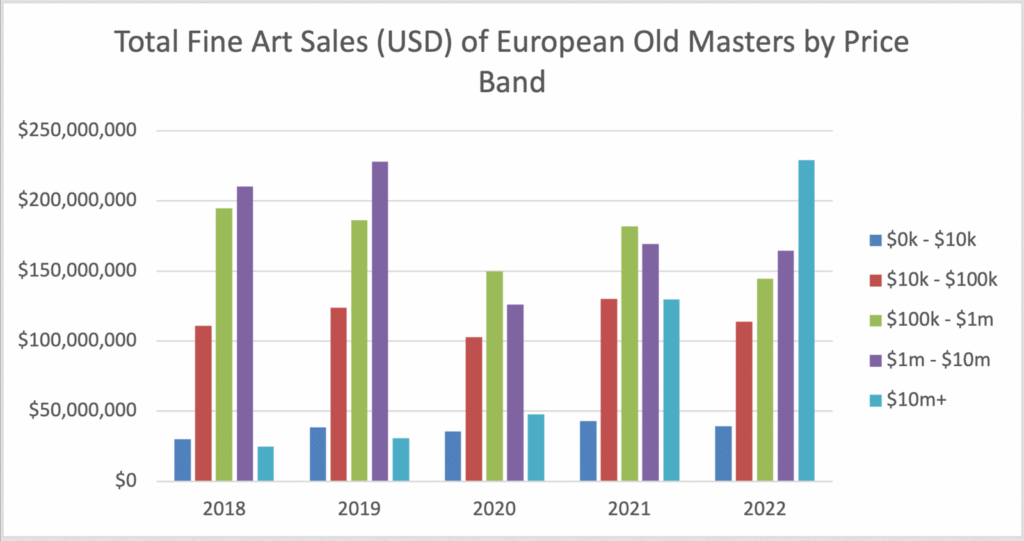 In 2022, $229.2M worth of European Old Master works sold for more than $10M each. That total was nearly $100M more than the previous high in 2021, when sales of lots over $10M totalled $129.8M.