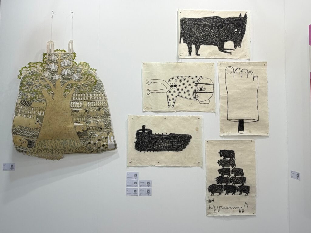 Among the artists presented, we particularly highlight Jumaadi, whose practice embodies this approach through a deeply narrative and introspective language. Based between Yogyakarta and Sydney, the artist constructs poetic visual worlds where love, whether romantic or familial, intertwines with mythological figures, spirits, and imagined creatures. His work unfolds as a form of storytelling rooted in personal memory and psyche, where fluid lines and delicate compositions trace emotional states and lived experience. Positioned at the intersection of intimacy and imagination, Jumaadi’s practice reflects a continuous negotiation between inner landscapes and cultural narratives.
