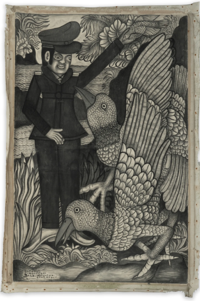 A retrospective of the Balinese artist Oototol is being presented simultaneously at the Roh Gallery and Komunitas Salihara. His works, painted in “grisaille” using the classical technique of wooden sticks and Indian ink, blend everyday life, the imagination, and social symbols.He often depicts figures in uniform (self-portraits) in various human and fantastical scenes.His world appears simple but reveals great symbolic and metaphorical complexity.His playful style explores the tension between the individual and society, as well as notions of power. His works remain rooted in Balinese cosmology, navigating the realms of life, death, and imagination.